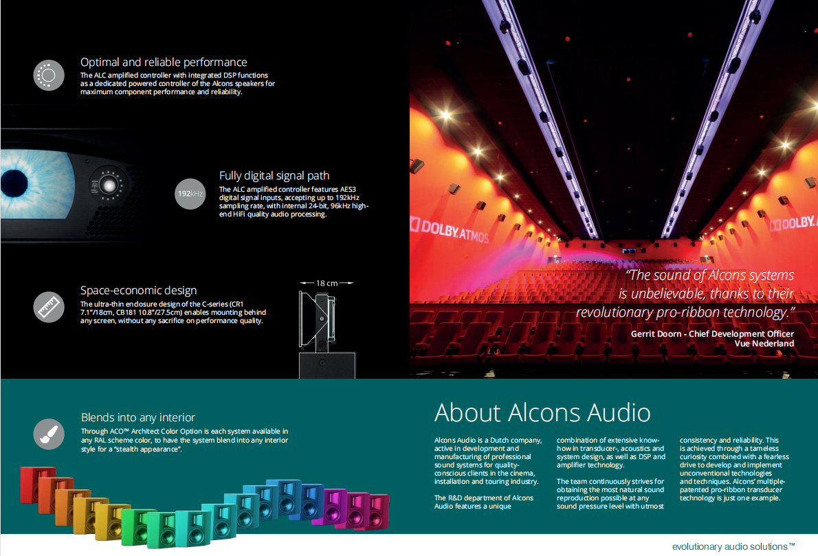 Alcons團隊把這一杰出成果應用到數字影院音響系統——C系列。C系列能提供HiFi聲質以及完美的清晰度,讓觀眾長時間觀看電影都不會出現聽覺疲勞。聲壓級覆蓋整個空間,大大提升遠離屏幕的觀眾聽覺上的享受,讓所有觀眾都能感受身臨其境的效果,讓觀眾與電影更親近。